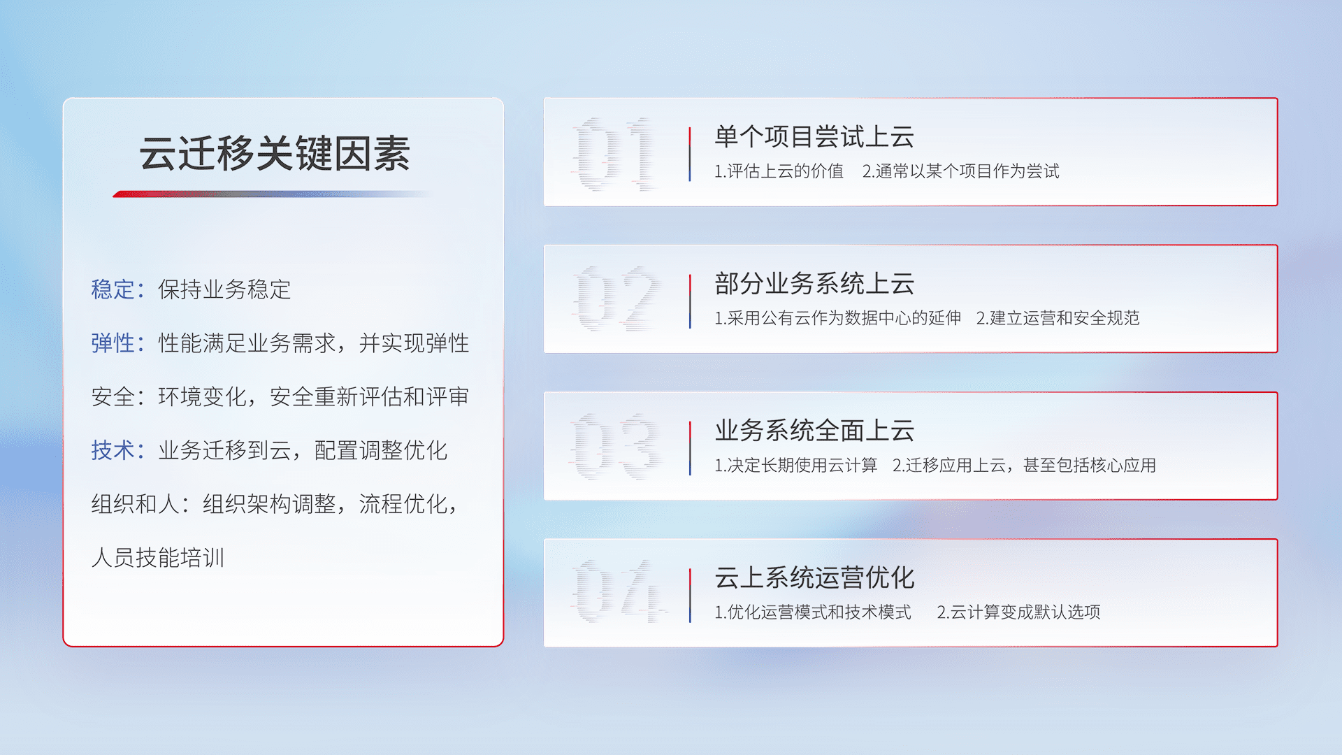 结合实际业务,,,,从规划设计、、、云平台选型、、、云原生改造、、、、数据迁移、、集成交付,,,,迁移全过程为客户识别最佳上云路径,,,,做好风险识别管理,,,,设计网络架构、、身份权限、、安全审计合规、、操作审计、、、、日志审计、、、、监控告警策略、、、多站点容灾设计等,,,,对云上基础设施进行整体规划,,,提升IT治理水平,,以满足弹性、、高可用、、高性能的需求。。