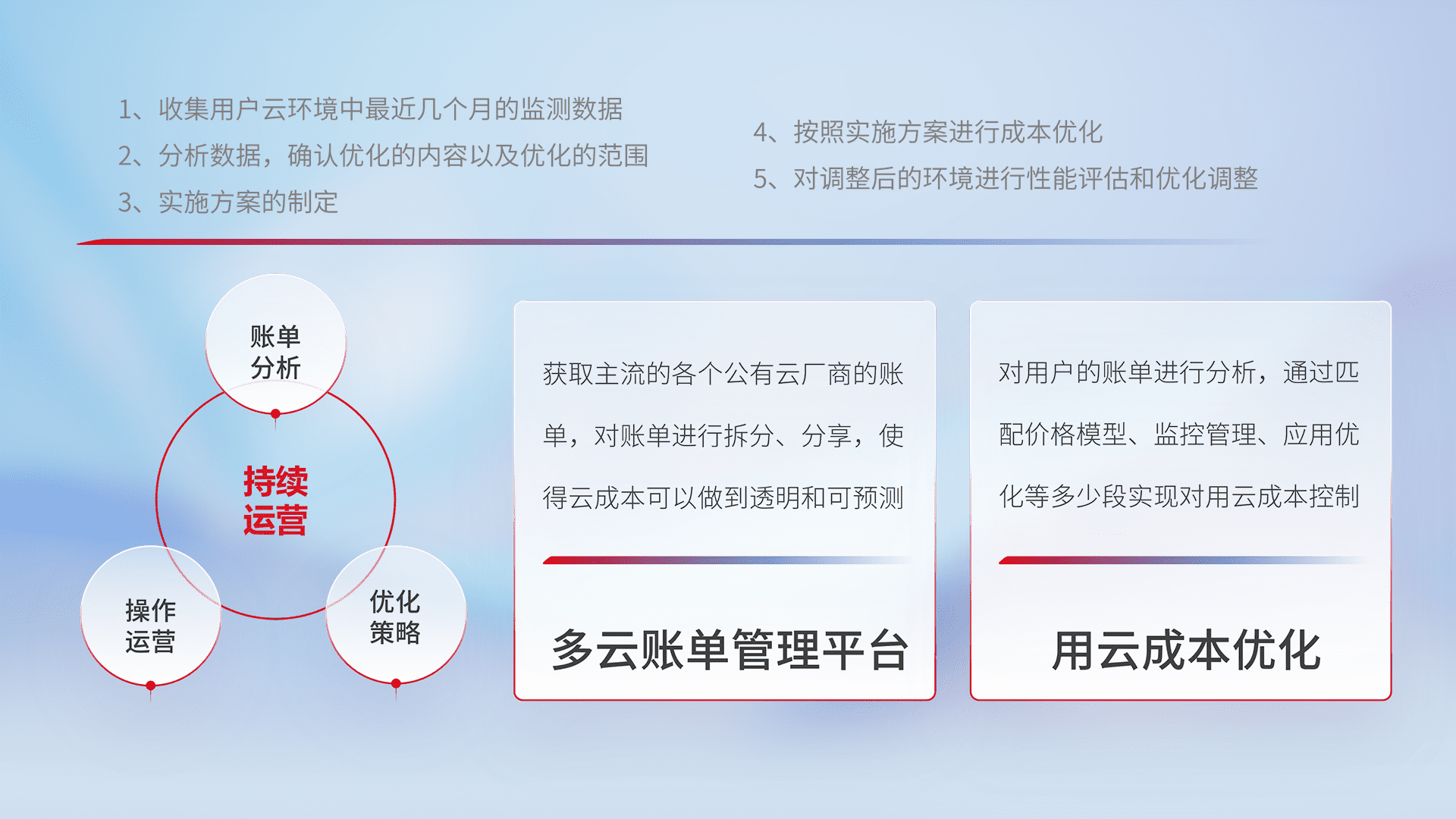 通过多云纳管,,,,以统一的资源数据模型把客户的云资源进行抽象和封装,,,,进而实现对多云资源的统一操作,,保障云资源管理的可靠性、、、、稳定性与可用性。。。。量身定制化运维内容,,,,配置、、、开发运维、、、、补丁管理、、备份、、监控、、、认证和访问管理、、、审计和日常巡检等,,,,保障在用云过程中的可靠度,,,,稳定度以及高可用率。。。。